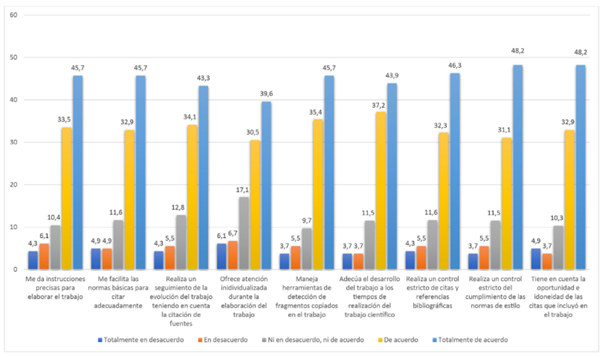 En cuanto a la actitud del profesorado ante el plagio académico, desde la percepción de los estudiantes universitarios, más del 40 % de los encuestados expresaron que los docentes supervisan, evalúan y fomentan las buenas prácticas en la citación de las fuentes utilizadas. No obstante, Gómez-Espinosa et al. (2022) señalan que la forma en que los profesores se desempeñan, de acuerdo con la percepción de los estudiantes, está estrechamente relacionada con la realización de actividades de plagio. Proponen implementar un programa de formación continua y sistemática para el cuerpo docente en cada institución educativa, con el objetivo de combatir el plagio.