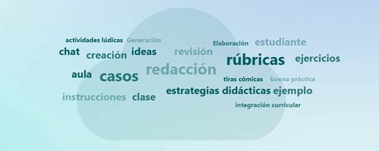 La figura 2 muestra que el uso a la fecha de este estudio por parte de los docentes se centra mayoritariamente en herramientas destinadas a la gestión de textos (ChatGPT y ChatPDF) y no tanto en aquellas que se utilizan para creación generativa de imágenes. Las personas declaran que utilizan estas herramientas como apoyo para la planificación de las lecciones, por ejemplo, para estructurar presentaciones o para crear rúbricas adaptadas a cada curso (ver figura 3). Otros han señalado que las utilizan como parte del aprendizaje activo para la resolución de casos en el contexto del aula y conceptualizaciones, así como la elaboración de ejercicios.