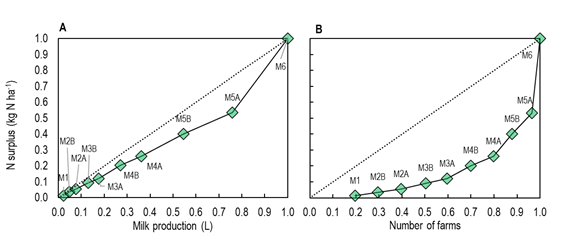 There was a disparity between modal dairy farms (2019) in their contribution to the national dairy N surplus, depending on how their contribution is assessed. When considered in terms of produced milk, all modal systems contributed rather proportionally, and thus, the cumulative milk production scaled almost equally with cumulative N surplus (Gini coefficient = 0.21: Figure 1A). However, modal dairy systems differed greatly in size, and therefore just 21% of the number of farms (i.e., those grouped in the M5B, M5A and M6 modal systems) accounted for 74% of the total national dairy N surplus (Gini coefficient = 0.69; Figure 1B).