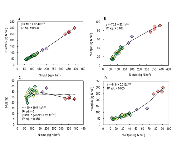 Farm-gate N surplus increased with intensification (Table 2, Figure 2 and Figure 3). Close positive relationships were observed between N surplus and N input (R2=0.998) and N output (R2=0.965). However, while N surplus increased proportionally more as N input increased (b=1.26; Figure 2A, Figure 2D), N output increased proportionally less (b=0.33; Figure 2B). Therefore, N surplus and N output had a markedly nonlinear link (b=2.14). As a direct consequence of these allometric relationships, NUE was not associated with N inputs in a simple way (R2=0.00; Figure 2C). Instead, NUE showed a complex relationship with N inputs, increasing up to 100 kg N ha-1 and decreasing above 200 kg N ha-1.