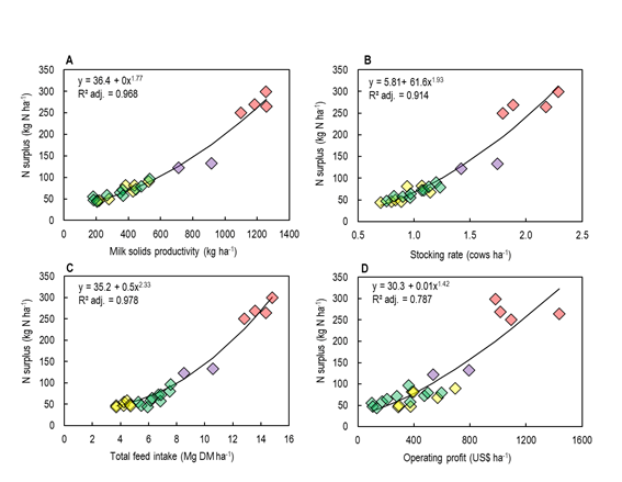 The link between N surplus and all indicators of intensification was also nonlinear. It increased at an accelerating rate as milk solids productivity increased (b=1.77; Figure 3A). This pattern was also clear for stocking rate (b=1.93), total feed intake (b=2.33), as well as for operating profit (b=1.42; Figure 3B-D). This means that increments in all these variables resulted in progressively more significant N surpluses.