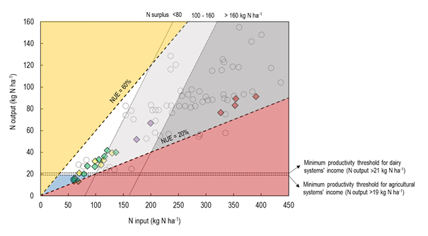 Optimal N performance targets would ideally combine the efficient use of high N inputs to sustain animal productivity while minimising N loss9. Plotting systems in terms of their N input and output allows us to assess their compliance (or not) with three concurrent targets22. First, a N output target is defined by the minimum profitability required to be competitive (e.g., against other land uses). Second, NUE targets set by achievable efficiency under local agroecological conditions. Third, a maximum N surplus target to avoid losses to the environment of harmful reactive N species. This is the most uncertain target and should be defined for the specific conditions according to environmental sensitivity and policy37.