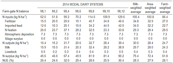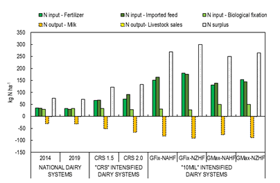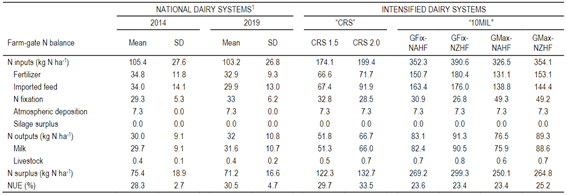 Table 2: Farm-gate N balance of the national average dairy systems (2014 and 2019) and the “CRS” and “10MIL” intensified systems