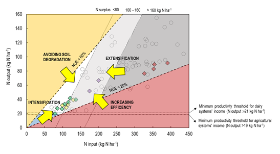 Figure 4: Annual N input and N output values of dairy systems mapped onto the framework proposed by the EU N Expert Panel22. The two dashed lines encompass the 20-60% range of desired NUE, as lower values risk increasing N pollution and higher values risk mining soil N. The horizontal dotted lines represent the N output associated with the minimum productivity to reach an operating profitable to either (i) remunerate the land and capital factors for current Uruguayan dairy systems or (ii) equal the average operating profit of current agricultural systems that compete for land with dairy systems. Finally, the shaded grey gradient represents the current uncertainty regarding what N surplus would lead to substantial losses of harmful reactive N species.