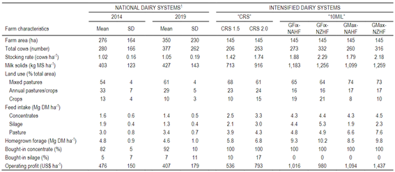 Table 1: Description of the national average dairy systems (2014 and 2019) and the “CRS” and “10MIL” intensified dairy systems
