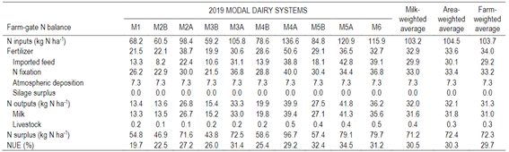 Table S5: Farm-gate N balance of the 2019 Modal dairy systems (M1, M2B, M2A, M3B, M3A, M4B, M4A, M5B, M5A, M6) and the milk-, area- and farm-weighted average