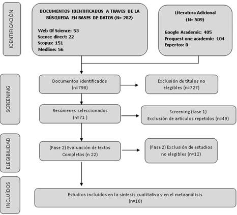 Se encontraron un total de 798 artículos. Se excluyeron 727 artículos debido a títulos no elegibles para los objetivos de la búsqueda. En esta etapa los motivos de exclusión de títulos obedecían principalmente a que los trabajos no correspondían a pruebas de detección. Después de seleccionar 71 estudios para la evaluación de títulos y resúmenes se eliminaron 49 trabajos repetidos (fase 1). Finalmente 22 estudios se consideraron elegibles para ser evaluados íntegramente. Después de la lectura del texto completo (fase 2), se excluyeron 12 estudios que no tenían como eje central la evaluación de pruebas de screening. Finalmente, se incluyeron 10 artículos para realizar la revisión sistemática y el