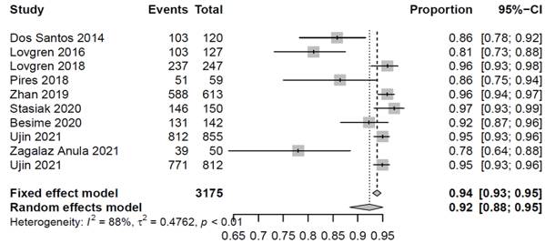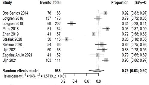 Especificidad: En las pruebas de detección para TTM se observó un menor valor de especificidad que de sensibilidad y una mayor heterogeneidad entre los resultados. Usando un modelo de efectos aleatorios el metaanálisis mostró una especificidad de (0.79) IC 95% (0.63-0.90). (Figura 3)