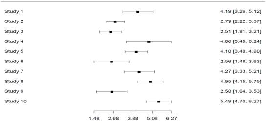 Los 10 estudios incluidos17,19,20,28-34 representaron un total de 4106 sujetos (2348 mujeres, 580 hombres, 878 género no especificado, con una proporción entre género masculino y femenino de 1 a 4). El rango de edad de estos estudios abarcó desde los 11 hasta los 78 años con una edad promedio de 3.7 años.
