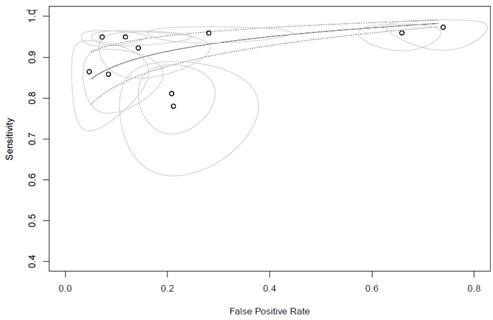 Se utilizaron datos de las tablas de dos por dos para calcular la sensibilidad, especificidad y valores predictivos de cada estudio. Los resultados de los estudios individuales se presentaron gráficamente, trazando las estimaciones de sensibilidad y especificidad (y sus intervalos de confianza del 95 %). Se realizaron estimaciones adicionales como el Odds Ratio diagnóstico y se utilizó un modelo de riesgos proporcionales para estimar el comportamiento de las pruebas sobre una curva de rendimiento diagnóstico (ROC), de este modo se pudo apreciar en un solo valor la capacidad de detección de las pruebas de detección de manera global.