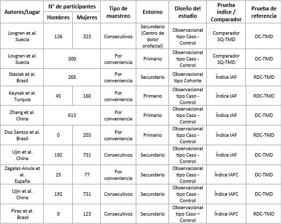 En cuanto a los sitios de recolección de muestra, se aceptaron estudios tanto de entornos primarios (centros odontológicos generales) como secundarios (centros especializados en dolor orofacial). Para establecer la condición objetivo, los pacientes de estos estudios respondieron a una evaluación clínica individual de TTM (particularmente ruidos articulares, limitación del movimiento mandibular, dolor muscular, articular y/o dolor pre auricular) de acuerdo a los criterios establecidos por el consorcio INFORM 25.
