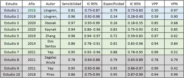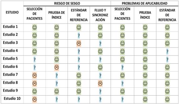 El mayor problema que presentaron tuvo relación con la selección de pacientes. Las recomendaciones de expertos en estudios de precisión diagnóstica (DTA) señalan que se debe evitar incluir pacientes seleccionados como casos y controles, dado que puede sesgar la precisión diagnóstica de una prueba. Como se ve reflejado en la tabla 1, solo 4 estudios incluyeron una muestra consecutiva de pacientes. En cuanto a la aplicabilidad, es decir, en qué medidas se pueden generalizar los resultados de estos estudios a otros pacientes y en otros lugares, todos los estudios presentaron un bajo riesgo de sesgo.