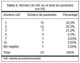 En lo que se refiere a la variable IAE se observó que del total de la muestra, 34,7% (33 casos) realizaron por lo menos un IAE, de ellos 48,5% (16 casos) son de sexo femenino y 51,5% (17 casos) son de sexo masculino; todos ellos presentaron ideación suicida.