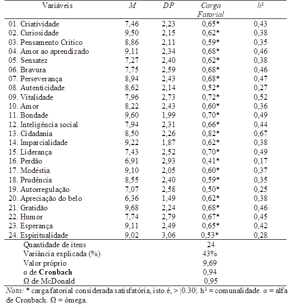 Como observado na Tabela 2, todas as 24 forças saturaram satisfatoriamente no fator com valor próprio igual a 9,69, explicando 43% da variância total, com cargas fatoriais acima do recomendado (> 0,30), variando de 0,41 (perdão) até 0,72 (vitalidade). Ademais, é possível observar também índices que indicam precisão satisfatória (α Cronbach= 0,94; Ω de McDonald= 0,95). Ademais, as forças mais presentes nas vidas dos nordestinos da amostra considerada foram gratidão e bondade, seguidas de curiosidade, imparcialidade, amor ao aprendizado e esperança. Ademais, destaca-se que a força espiritualidade teve o maior desvio padrão, indicando uma maior dispersão e variabilidade das pontuações.