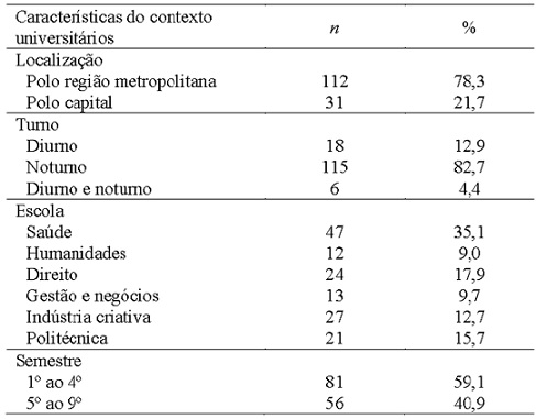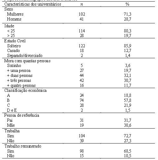 Conforme a classificação econômica brasileira, a maioria dos participantes foi considerada como pertencente a classe B (ABEP, 2015). No que diz respeito à saúde mental, os participantes afirmaram por meio de auto relato que fazem uso de medicamento psiquiátrico (12,6 %, n = 18) e 17,5 % (n = 25) afirma fazer psicoterapia. Quanto a possíveis avaliações diagnósticas, 14 (9,8 %) participantes afirmaram já possuir algum diagnóstico de transtorno de ansiedade e/ou depressão. Demais dados do perfil dos universitários foram descritos na Tabela 1.