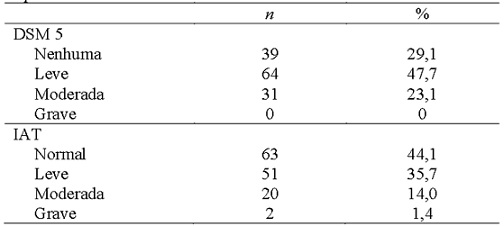 Acerca da dependência de internet, os participantes foram avaliados por meio do IAT e de uma adaptação dos critérios do Transtorno de Álcool e outras drogas para dependência de internet do DSM-5 (APA, 2014). É importante destacar que esta adaptação foi realizada pelo grupo de pesquisa, sendo necessário mais estudos para verificar a validade e fidedignidade da adaptação. Os resultados apontam que a maior parte dos alunos apresenta dependência leve a moderada das mídias sociais, conforme apresentado na Tabela 3.