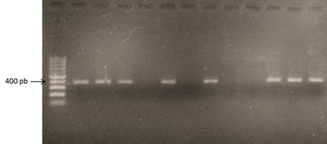 Se realizó PCR anidada para la detección del genoma viral en 17 muestras tomadas al azar, siguiendo un protocolo de amplificación descrito por Wellenberg et al. (2001). En este paso se obtuvo un fragmento de 615 pb y luego de la segunda ronda de amplificación, un fragmento de 364 pb del gen que codifica para la glicoproteína B (gB) del BoHV-4 (Campos et al., 2014). Los productos de amplificación se visualizaron en geles de agarosa al 1,5%, teñidos con Good View Nucleic Acid Stain. Como control positivo se utilizó la cepa Movar, gentilmente cedida por el laboratorio de Virología del Instituto de Ciências Básicas da Saúde (ICBS) de la Universidad Federal de Río Grande del Sur (UFRGS) - Brasil. El mismo se utilizó a diferentes diluciones.