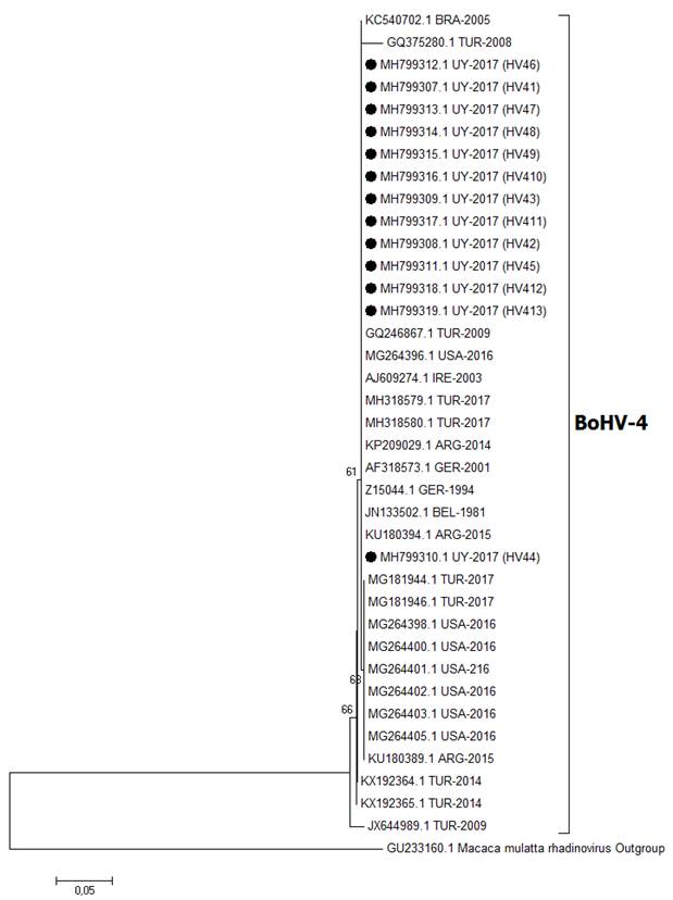 Figura 2:  Árbol filogenético del fragmento del gen que codifica para la glicoproteína B (gB) de BoHV-4. Se muestra la relación filogenética de las secuencias de Uruguay (rombo negro) (Número de acceso: MH799307, MH799308, MH799309, MH799310, MH799311, MH799312, MH799313, MH799314, MH799315, MH799316, MH799317, MH799318, MH799319) y cepas de referencia depositadas en el GenBank provenientes de Brasil, Argentina, Turquía, Alemania, Bélgica, EE.UU, Irlanda. El análisis incluyó 38 secuencias de BoHV-4 y como virus externo el Macaca mulatta rhadinovirus.