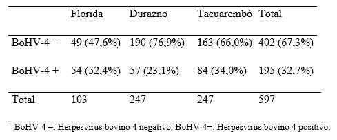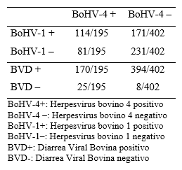 Del total de 597 muestras, 285 (47,7%) fueron positivas a anticuerpos contra BoHV-1, 114/597 (19,1%) fueron positivas a ambos herpesvirus (BoHV-1 y BoHV-4), las 81 muestras restantes de las 195 positivas a BoHV-4, no lo fueron para el BoHV-1. En cuanto al BVDV 564/597 animales fueron seropositivos (94,5%), 170 de los cuales (30,1%) fueron seropositivos a BoHV-4 (Tabla 3).