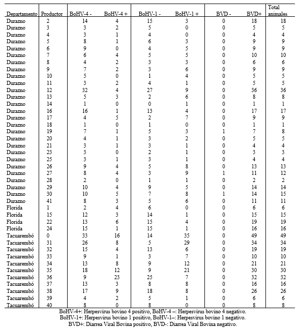 En cuanto a los resultados del experimento 1, de los 550 sueros analizados, se observó que todos productores tenían la mayoría de sus animales seropositivos al BVDV, mientras que para el BoHV-4 siete (7/41) productores (5 de Durazno y 2 de Tacuarembó) no presentaron animales seropositivos para este virus, mientras que los productores de Florida todos tenían algún animal seropositivo a BoHV-4. Para BoHV-1 cinco (5/41) productores no presentaron animales con serología positiva contra este virus (Tabla 4).