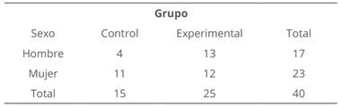 La Tabla 2 indica la distribución de la muestra. Al finalizar la implementación se constató abandono escolar en ambos grupos: 2 participantes del grupo experimental (2 mujeres) y 18 del grupo control (8 hombres y 10 mujeres). Asimismo es importante aclarar que debido a la alta deserción en el grupo control se decidió contactar a desertores para investigar las razones ya que esto podría ser un indicador de AMO.