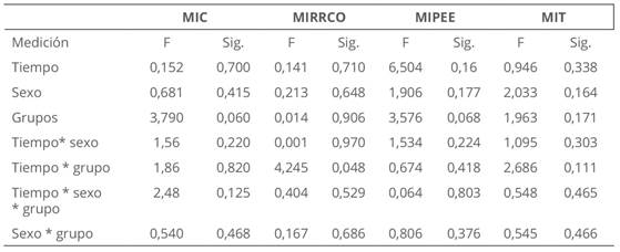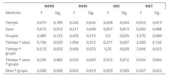 En la Tabla 5 puede observarse que hay diferencias en la variable MEI por grupo (F: 5,50; p =,025), así como en la interacción tiempo (mediciones) * grupo (F: 5,25; p = 0,29). Esto es, en cuanto a la variable grupo, el grupo de estudio desde el inicio tuvo puntajes mayores de MEI que el grupo control y así sucedió en la segunda medición. Empero, tal como puede observarse, esto no es un efecto de la implementación de la metodología ya que no hubo diferencias en las variables y en la interacción. Lo mismo ocurrió en la variable MET por grupo (F: 3,27; p = 0,08). Asimismo se observan interacciones significativas en la variable MERE (tiempo * sexo, F: 5,194; p = 0.029) y tiempo * grupo (F: 5,75; p = 0,022). No obstante, al no haber diferencias en las variables principales, las interacciones significativas no son representativas de algún hallazgo importante.