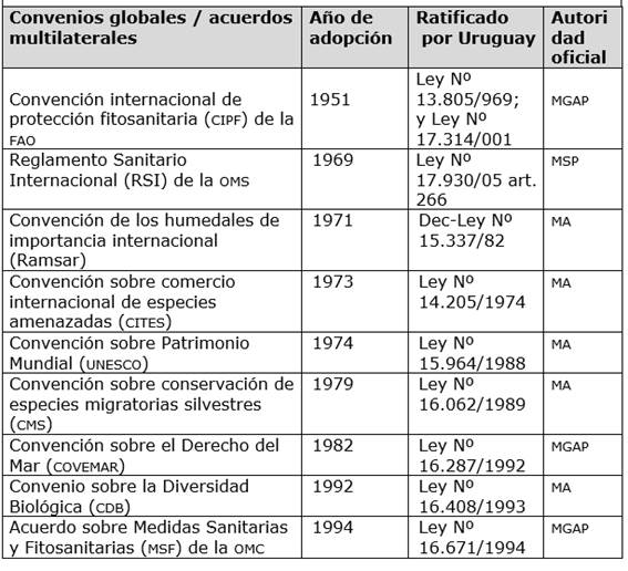 Abreviaturas: OMC: Organización Mundial de Comercio; OMS: Organización Mundial de la Salud; OMI: Organización Marítima Internacional; fao: Organización de las Naciones Unidas para la Alimentación y la Agricultura; unesco: Organización de las Naciones Unidas para la Educación, la Ciencia y la Cultura; MA: Ministerio de Ambiente; MD: Ministerio de Defensa; MGAP: Ministerio de Ganadería Agricultura y Pesca; MSP: Ministerio de Salud Pública.