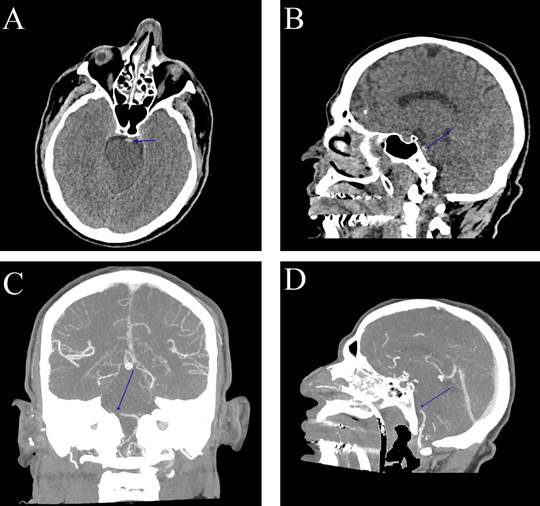 A 30-year-old man had a seizure 30 minutes ago. He developed decreased consciousness associated with recurrent seizures, coarse limb tremors, and fever unresponsive to antipyretics. He is a cocaine user and had been abusing it before the seizures. Axial cranial computed tomography (CT) scan shows a hyperdense artery sign in the basilar artery (Figure 1 A ), and sagittal CT angiography (CTA) detects a filling defect in the basilar artery due to contrast, diagnosing basilar artery thrombosis (Figures 1 B-D ). After imaging, he progressed to loss of oculocephalic reflex, corneal reflex, ciliospinal reflex, and no motor response to painful stimuli. One hour later, in the intensive care unit (ICU), he presented decorticate posturing followed by decerebrate posturing. One day later, the patient died in the ICU.