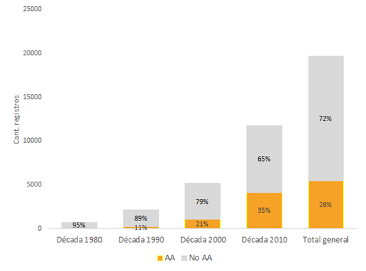 Los resultados son presentados en el orden planteado en la metodología. La búsqueda arrojó 19.679 registros, de los cuales el 28 % es de AA y el resto de acceso cerrado o sin dato.