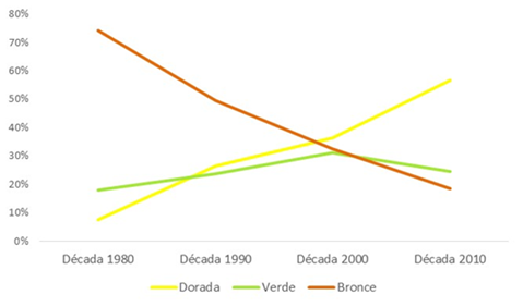 El Gráfico 2 muestra la evolución de la proporción de las tres categorías consideradas. La vía dorada aumentó a una tasa promedio en el período de 113 %, la verde, a una tasa promedio de 14 % y la bronce decreció a una tasa promedio de −37 %. Con relación a la vía verde, llama la atención que después del año 2000 dejó de crecer y presenta una tendencia sostenida a la baja hasta la actualidad.