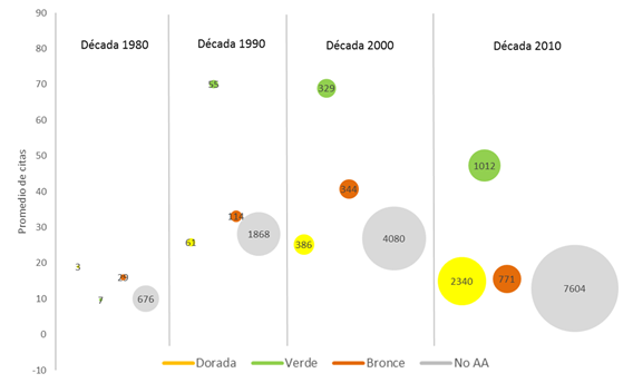 El Gráfico 3 muestra que, al desagregar cada vía a lo largo de las cuatro décadas, destaca la vía verde con el mayor promedio de citas en las tres últimas décadas, que son las de mayor producción, seguida de la vía bronce. También resalta que a lo largo de las cuatro décadas la vía dorada tiene en promedio casi las mismas citas que los trabajos cerrados.