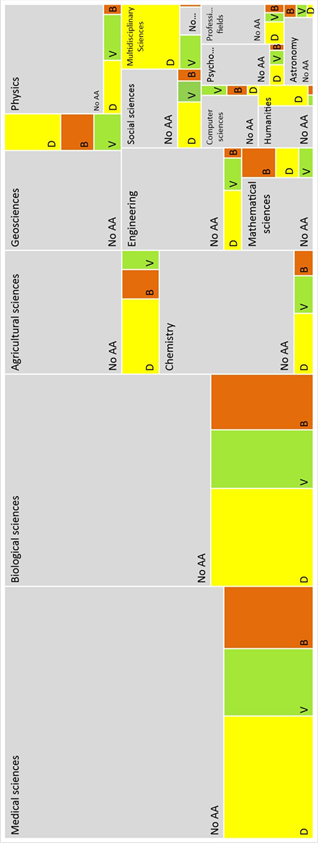 El área que proporcionalmente tiene más artículos en AA es multidisciplinary sciences con un 89 %, pero hay que recordar que solo representa un 2 % de los documentos analizados y, justamente por la participación de muchas áreas o disciplinas, la categoría es esquiva a análisis de este tipo. Le siguen con un 33 % en AA biological sciences y humanities. Las que tienen menos proporción de trabajos en AA son chemestry, engineering, physics, astronomy y computer sciences con 16 % o menos.