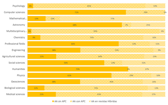 El Gráfico 5 muestra tres categorías de AA: AA sin APC, AA con APC y AA en revistas híbridas (cerradas, con pago de APC), por áreas de conocimiento. Las áreas en las que tienen más peso las revistas de AA sin pago de APC son humanities, computer sciences, astronomy, profesional fields y physics con más de ⅗ de su producción. En el otro extremo, se encuentran las multidisciplinary sciences y psychology, con solo 3 % y 4 % respectivamente de artículos en AA sin pago de APC. En cuanto a las áreas de medical sciences y biological sciences, que son las de mayor contribución a la producción nacional, el 21 % y el 12 % respectivamente son artículos sin pago de APC.