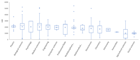 Al abrir por área, como se puede observar en el Gráfico 6, hay bastante heterogeneidad de costos entre las distintas áreas y, a su vez, dentro de cada una, puede haber diferencias significativas. Por ejemplo, mientras que para social sciences el promedio de APC alcanza los USD 980 (el menor), para physics el promedio llegó a los USD 2134 (el mayor) y, al interior de estas áreas, hay escasas variaciones, aunque aparecen algunos outliers (costos atípicos). Entre los costos de APC atípicos, de más de USD 5000, destacan los de revistas de biological sciences, medical sciences, multidisciplinary sciences y geosciences.