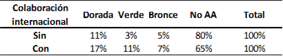 Al analizar la colaboración internacional se observa que la proporción de trabajos en AA es superior cuando los autores nacionales colaboran con extranjeros, alcanzando el 35 %, mientras que cuando publican solos se sitúa en el 20 %. Esta diferencia en favor del AA en los trabajos con colaboración internacional se mantiene en todas las vías, haciéndose más pronunciada en la vía verde con una distancia de ocho puntos porcentuales y en la dorada con seis puntos porcentuales, como lo muestra el Cuadro 1. Este fenómeno ya había sido reportado por Morillo (2020) y también por Valderrama-Zurián, Aguilar-Moya y Gorraiz (2019), aunque solo para la disciplina educación y con ventaja para la vía dorada.