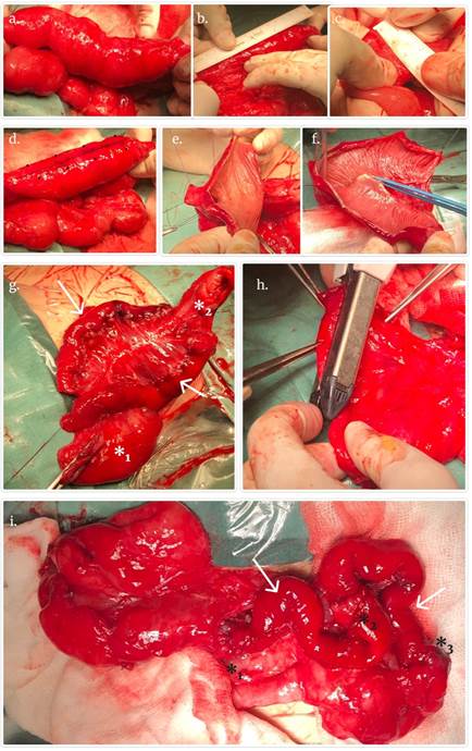 Fig.1 Técnica de Bianchi. a-c) Selección de asa midiendo longitud y diámetro. d y e) División longitudinal del borde antimesentérico, previa colocación de puntos tractores a ambos lados de la línea media, separados por 2 cm; queda expuesta la mucosa intestinal. f) División del borde mesentérico con electrocauterio bipolar. g) Ambas hemiasas confeccionadas (flechas), yeyuno dilatado (asterisco 1) y colon (asterisco 2). h) Remodelación yeyunal con máquina de sutura lineal cortante. i) Resultado final, ambas hemiasas (flechas), anastomosis proximal (asterisco 1), anastomosis entre ambas hemiasas (asterisco 2), y anastomosis distal (asterisco 3). Fuente: autores