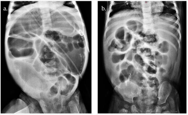 Fig.2 Radiografías simples de abdomen. a) Radiografía preoperatoria de procedimiento de Bianchi, gran dilatación de asas yeyunales; colon de menor calibre sin su posición anatómica normal dado su condición previa de malrotación por su gastrosquisis. b) Postoperatorio de Bianchi, nótese la disminución franca de diámetro de asas luego de la cirugía. Fuente: autores