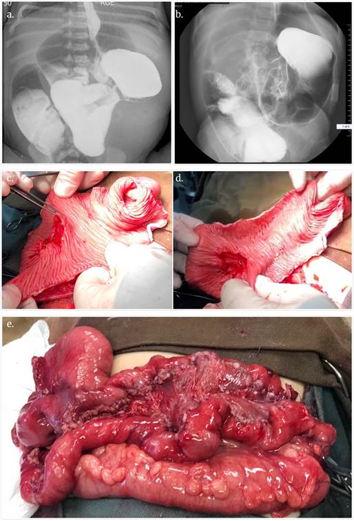 Fig.3 a y b) Estudio contrastado de intestino delgado que muestra marcada dilatación yeyunal prepoperatoria. c y d) Foto intraoperatoria del asa elegida para elongación, ya abierta por su borde antimesentérico, visualizándose la mucosa intestinal, y realizando apertura del borde mesentérico. e) Resultado final. Fuente autores