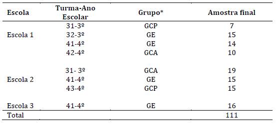 A amostra foi composta inicialmente por 145 crianças, sendo 34 excluídas por: a) rebaixamento intelectual (percentil 25 ou inferior no teste Matrizes Progressivas Coloridas de Raven adaptado para o português brasileiro por Angelini et al. (1999) (n = 15), b) deficiências sensoriais não corrigidas, condições médicas de ordem genética, psiquiátrica ou neurológica (identificados através de questionários respondidos pelos pais e relato dos professores) (n = 6), c) total de faltas superior a quatro durante a execução da intervenção (n = 6), d) não completar as duas etapas da avaliação (n = 3), e) trocar de escola durante o semestre (n = 4). Assim, a amostra final foi composta por 111 crianças de 3 escolas públicas da região metropolitana de Porto Alegre (Rio Grande do Sul - Brasil). A distribuição dos grupos pode ser visualizada na Tabela 1.
