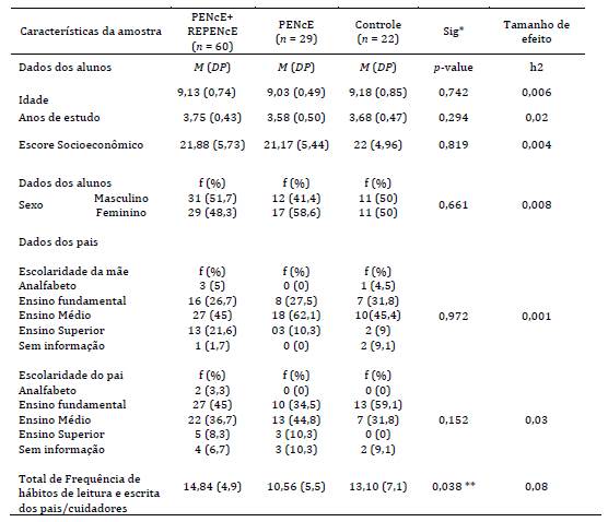 A Tabela 2 apresenta as características sociodemográficas da amostra para os três grupos na linha de base. Como pode ser observado na Tabela 2, os grupos não apresentaram diferenças significativas na avaliação pré-intervenção em variáveis sociodemográficas. Contudo, o grupo misto PENcE+REPENcE se diferenciou significativamente quanto à frequência de hábitos de leitura e escrita de seus pais/ cuidadores, quando comparado ao grupo PENCE, apresentando maiores hábitos, com tamanho de efeito médio. A Tabela 3 4 y 5 apresenta a comparação entre os três grupos na avaliação pré-intervenção quanto à performance em tarefas de desempenho executivo, emocional e escolar na linha de base de cada grupo.