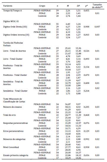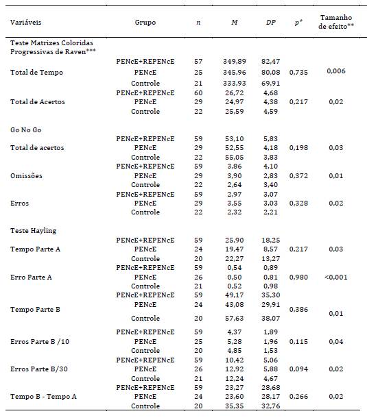 O grupo controle apresentou melhor desempenho no total de ensaios administrados no WCST. Por fim, os grupos PENCE e controle apresentaram melhores escores nas tarefas de fluência verbal. Ademais, resultados interessantes foram evidenciados com efeito para a covariável total da frequência de hábitos de leitura e escrita dos pais/cuidadores, sendo possível verificar resultados significativos na ordem direta do subteste dígitos e quanto ao total de respostas corretas no WCST. Neste estudo não foram evidenciados resultados significativos em relação ao Delta para desempenho escolar (aritmética do TDE-II e notas) entre os três grupos.