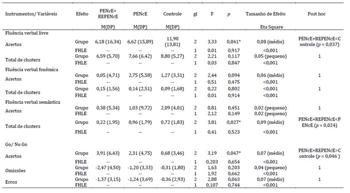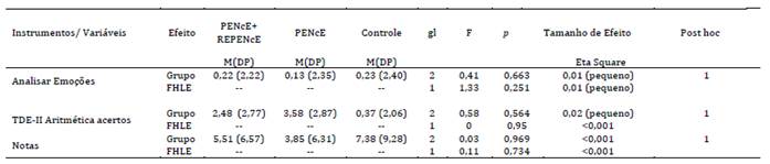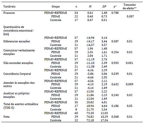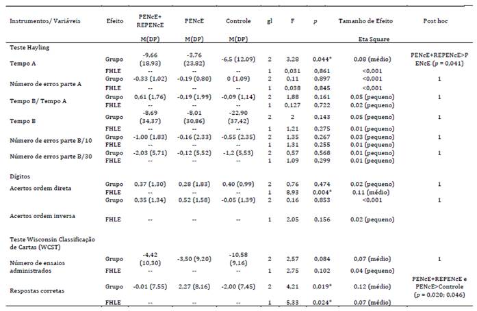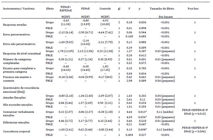 Conforme apresentado na Tabela 3, os grupos não apresentaram diferenças significativas na avaliação pré-intervenção em relação às medidas de funcionamento executivo, de consciência emocional e de desempenho escolar. Assim, podem ser considerados indistintos na sua linha de base. Na Tabela 4 7 8 9 , é possível verificar os resultados da comparação entre grupos considerando o Delta de cada variável, controlando-se o efeito da frequência de hábitos de leitura dos pais/cuidadores dos alunos. Verificou-se que as crianças que participaram do grupo misto PENcE+REPENcE apresentaram escores significativamente melhores no Tempo A do Teste Hayling, bem como nas variáveis “Consciência Corporal” e “Comunicar verbalmente as emoções” do Questionário de Consciência Emocional (EAQ), quando comparado ao grupo PENcE. Além disso, o grupo misto apresentou escores significativamente melhores, no total de acerto no Go no Go, e o PENcE apresentou menos erros neste mesmo instrumento, ambos em relação ao grupo controle. Os dois grupos, PENcE+REPENcE e PENcE apresentaram diferenças significativas quanto ao total de acertos no WCST em relação ao grupo controle.