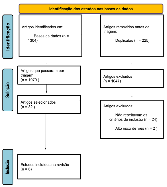 Após aplicação da estratégia de busca nas bases de dados, foram encontrados 1304 artigos, dos quais 225 duplicatas foram removidas. Foram analisados por título e resumo 1079 artigos, dos quais 1047 foram excluídos. 32 artigos foram analisados a partir da leitura completa do artigo e destes, 24 foram excluídos por não utilizarem práticas de mindfulness baseadas em algum protocolo já existente, por ter tido público com faixa etária acima dos 60 anos ou por não terem sido estudos randomizados. Para análise do risco de viés, restaram 8 artigos, dos quais 6 apresentaram baixo risco de viés e foram incluídos na análise final do estudo. A Figura 1 mostra o diagrama Prisma do estudo.