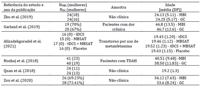 Em três destes estudos (Quan et al., 2018; Zhu et al., 2019; Zou et al., 2020), a população foi não-clínica e nos outros três, a população clínica foi de participantes com dor crônica (Garland et al., 2019), transtorno por uso de metanfetamina (Alizadehgoradel et al., 2021) ou adultos diagnosticados com TDAH (Hoxhaj et al., 2018).