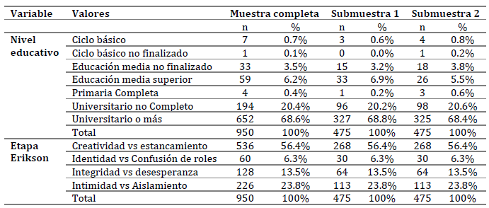 La muestra total se conformó por 950 mujeres residentes de Montevideo de 18 a 82 años (M= 45.99; DE= 13.34), a través de un muestreo no probabilístico. Con la intención de realizar los análisis factoriales exploratorios y confirmatorios se realizaron dos submuestras estratificadas y aleatorias a partir de la muestra original. La estratificación se realizó a partir de la edad y el nivel académico alcanzado. Con la primera submuestra se realizó el análisis factorial exploratorio, esta se conformó por 475 participantes de 18 a 80 años (M= 45.99; DE= 13.3), la segunda submuestra fue utilizada para el análisis factorial confirmatorio y se conformó por 475 participantes de 18 a 82 años (M= 45.99; DE= 13.39; Tabla 1).