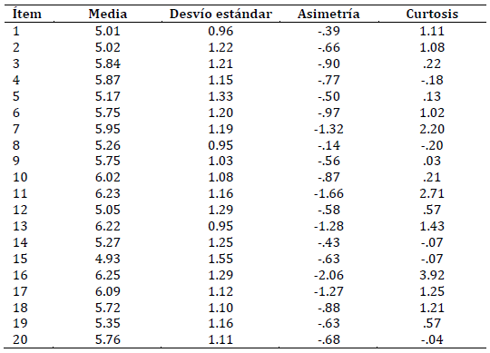 Los ítems del PIL presentaron medias que oscilan entre 4.93 y 6.25, con desviaciones estándar entre 0.95 y 1.55, lo que sugiere una dispersión moderada de las respuestas y una tendencia general hacia puntajes medios-altos en la escala utilizada (Tabla 2). En términos de asimetría, la mayoría de los ítems mostraron valores negativos, lo que indica una concentración ligera hacia los valores superiores de la escala. Este patrón es particularmente notable en ítems relacionados con temas emocionales o existenciales, como el ítem 16 ("Con respecto al suicidio"), que exhibió una asimetría de -2.06 y una curtosis de 3.92, lo que refleja una mayor concentración de respuestas en los extremos superiores de la escala.