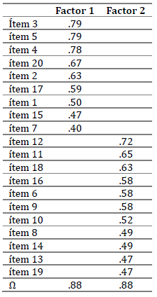 Del AFE realizado se extrajeron dos factores (Tabla 3) que explicaron el 25 % y el 24 % de la varianza total, y en su conjunto explican el 50 % de la varianza total de la prueba (índice de Kaisser-Meyer-Olkin (KMO = .88) y la prueba de esfericidad de Bartlett (χ 2(190) = 4497.68; p < .001). Los factores mostraron consistencia interna adecuada: Factor 1 ω = .88 y Factor 2 ω = .88.