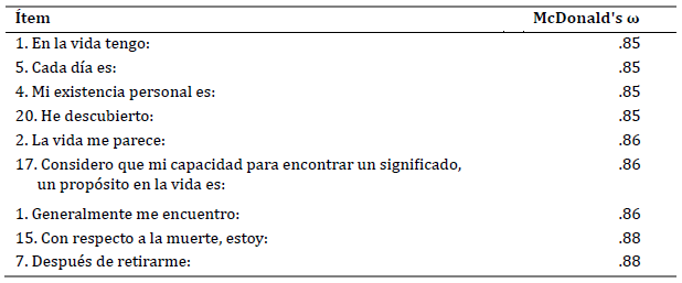 Se utilizó la versión en español realizada por Noblejas de la Flor (1994) del The Purpose in Life Test (PIL), de Crumbaugh y Maholick (1964), específicamente la parte A, que mide el constructo de manera cuantitativa. Es una escala compuesta por 20 ítems Likert con opciones de respuesta que van de 1 al 7, en la cual el número 4 corresponde a una posición neutral. En la versión de Noblejas de la Flor (1994) se reportó una estructura factorial de cuatro factores: percepción de sentido, experiencia de sentido, metas y tareas, y dialéctica destino-libertad, es importante mencionar que había ítems que cargaban en más de un factor, y no se mencionaron datos de la confiabilidad de sus puntuaciones.