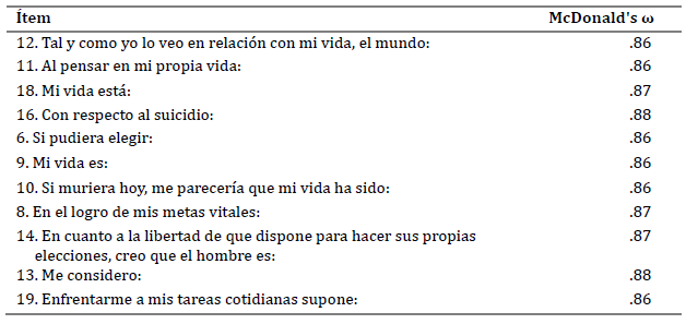 La confiabilidad de la escala ha sido adecuada, evidencia que ha sido corroborada en los distintos estudios instrumentales que la han evaluado en versiones de idioma español (Caycho-Rodríguez et al., 2022; García-Alandete et al., 2013; Martínez Ortiz et al., 2012), así como a nivel global (Arunjit et al., 2024; Zhang et al., 2023), específicamente se puede comparar con los resultados de validaciones realizadas en contexto argentino que contenían los 20 ítems originales, que reportaron valores de Alfa de Cronbach a partir de .80 (Gottfried, 2016; Simkin et al., 2018).