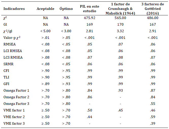 En la Tabla 6 se presentan los resultados del AFC que evalúa los factores identificados en el análisis exploratorio, y su comparación con los modelos de un factor propuestos por Crumbaugh y Maholick (1964) y de tres factores de Gottfried (2016), ambos aplicados a una muestra de población argentina. Los resultados revelan indicadores óptimos que respaldan la estructura factorial de dos factores correlacionados, evidenciada a través de índices de ajuste tanto incrementales como absolutos, así como la razón χ²/gl. Además, se evaluó la Varianza Media Extraída (VME) como indicador de validez convergente para este modelo de dos factores; aunque el valor correspondiente al segundo factor no alcanzó el umbral de .50, se encontró notablemente cercano al ideal. Finalmente, se constató la alta confiabilidad de las puntuaciones, evaluada mediante el coeficiente omega de McDonald, lo que refuerza la solidez del modelo analizado. Además de esta evidencia, se puede considerar reportar un puntaje general dado que el modelo de dos factores explica un total del 70 % de la varianza, con un 50 % atribuido al primer factor y un 20 % al segundo, lo que indica que ambos factores son significativos y relevantes.